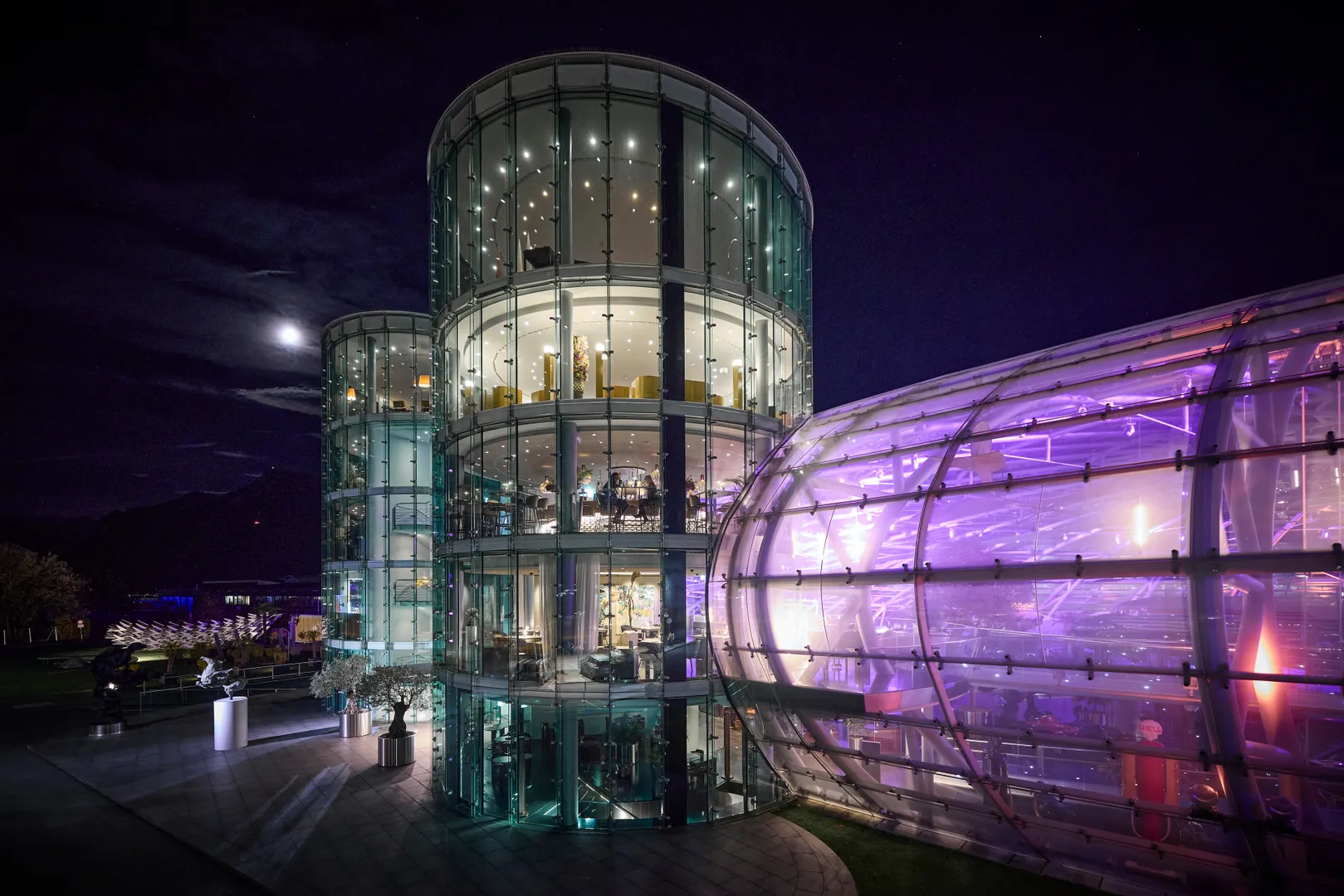Despite containing 1,200 tonnes of steel and 380 tonnes of specialised glass, the construction feels light, elegant and aerodynamic. No two of the 1,754 glass panes are identical. Two glass cylinders were integrated into the design to house the bar, restaurant, lounge and administration areas – and at the same time, they serve as key structural elements by providing transverse bracing. Additional stability is provided by a stiffening ring at the crown of the shell. With the installation of a glass floor and an arched walkway, the Threesixty Bar was born. Further ramps and terraces around the twin towers offer fresh perspectives on the ever-changing exhibits inside Red Bull Hangar-7.