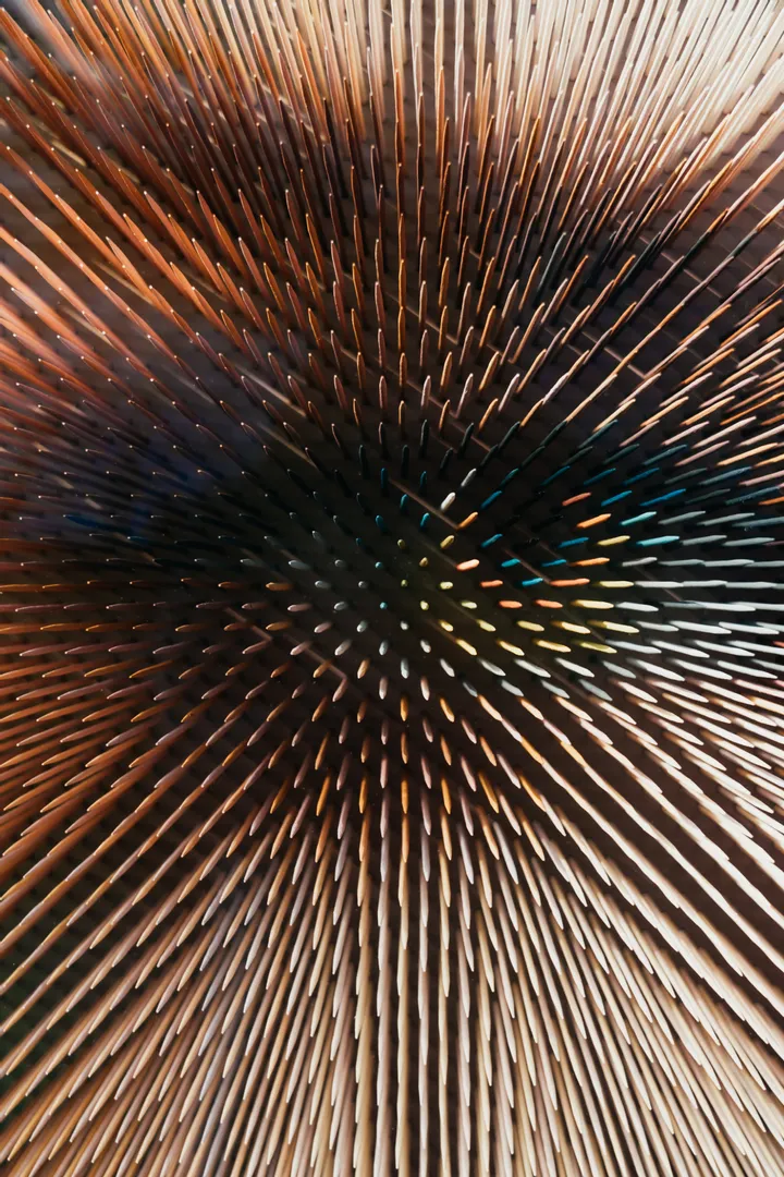 The artist is particularly known for his three-dimensional portraits, which are built up from modular elements such as thousands of colored wooden pencils. The path to this characteristic formal language was the result of a long process of reduction: from early images of saints and collages to the individual point as a fundamental pictorial unity. The single point as the origin; like a Big Bang, refers to the origin of all things from a small but powerful spark.